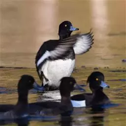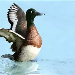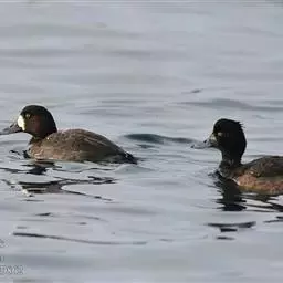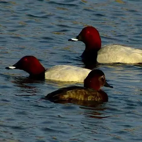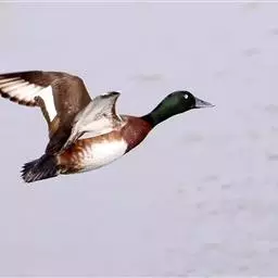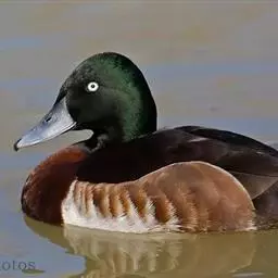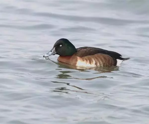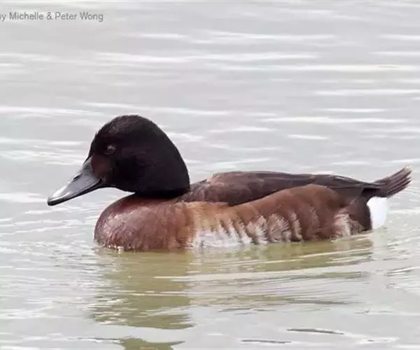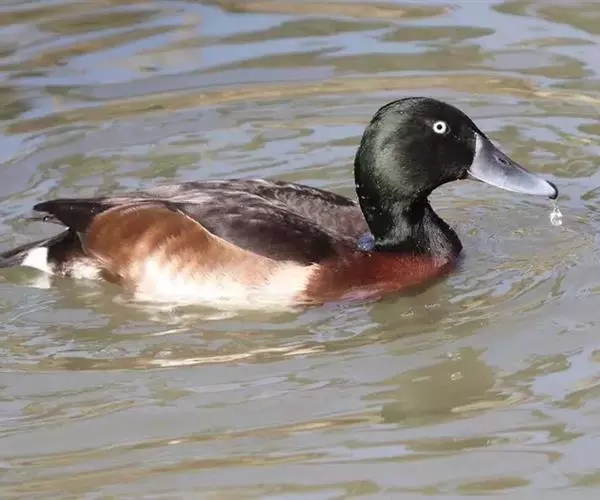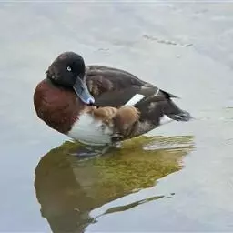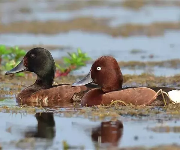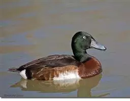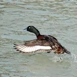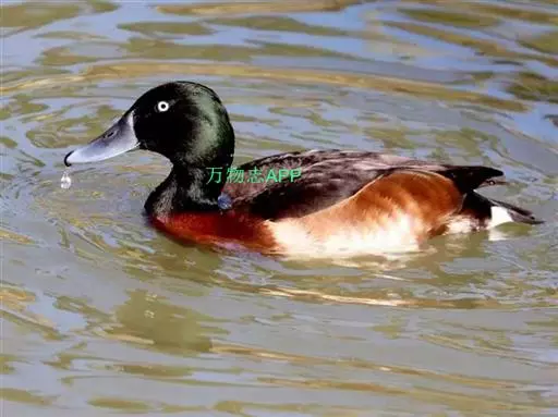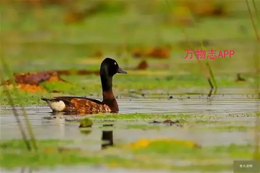 青头潜鸭(学名:Aythya baeri):是雁形目鸭科潜鸭属的鸟类。体圆,头大,雄鸟头和颈黑色,并具绿色光泽,眼白色。上体黑褐色,下背和两肩杂以褐色虫蠹状斑,腹部白色,与胸部栗色截然分开,并向上扩展到两胁前面,下腹杂有褐斑;两肋、淡栗褐色,具白色端斑。雌鸟体羽纯褐色。