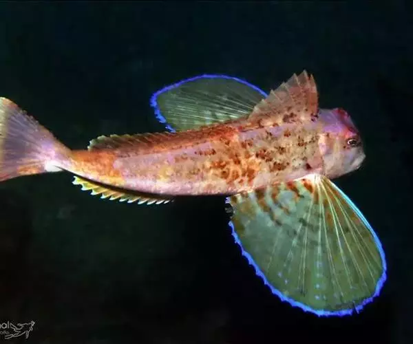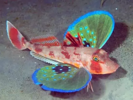 绿鳍鱼(学名:Chelidonichthys kumu),俗称 绿翅鱼、绿姑、鲂鮄、国公鱼、绿莺莺、角鱼、红祥、大头鱼、蜻蜓角。体延长,稍侧扁,前部粗大,后部渐细。一般体长14~30厘米、体重150~300克、头大近方形,吻角钝圆,两颌及犁角具绒毛齿。头部、背面与两侧均被骨板,体被小圆鳞、头部及背侧面红色,并有黄色网状斑纹。背鳍两个,分离。其两侧各有1纵列棘楯板;胸鳍长而宽大、位低,下方有3条指状游离鳍条,内侧为具斑点的艳绿色;尾鳍截形。后缘白色。