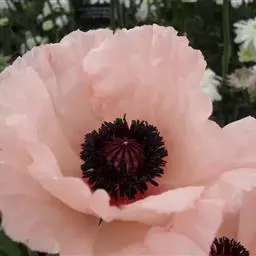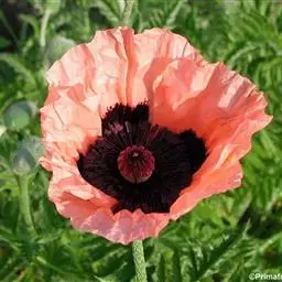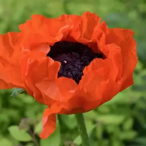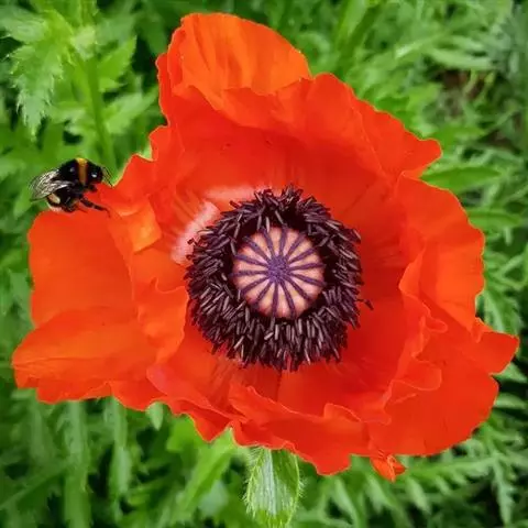 多年生草本,高80-120cm,主根纺锤状,全株具刚毛,茎不分枝。 叶质较厚,叶片不抱茎,卵形至披针形,二回羽状深裂,小裂片具疏齿或缺刻状齿,两面绿色。 花瓣红色或深红色,并有粉色品种,基部有紫色斑块,花丝深紫色。 蒴果近球形,直径2-3.5cm,成熟时苍白色。