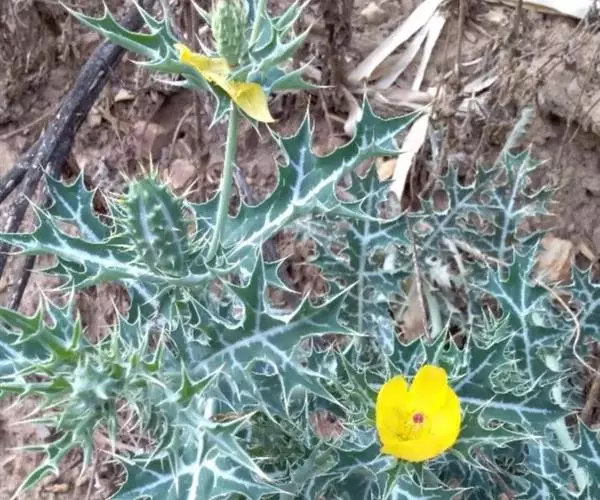 基生叶密聚,叶片宽倒披针形、倒卵形或椭圆形,长5-20厘米,宽2.5-7.5厘米,先端急尖,基部楔形,边缘羽状深裂,裂片具波状齿,齿端具尖刺,两面无毛,沿脉散生尖刺,表面绿色,沿脉两侧灰白色,背面灰绿色;叶柄长0.5-1厘米;茎生叶互生,与基生叶同形,但上部叶较小,无柄,常半抱茎。花单生于短枝顶,有时似少花的聚伞花序;花梗极短。花芽卵形,长约1.5厘米;萼片2,舟状,长约1厘米,先端具距,距尖成刺,外面无毛或散生刺,花开时即脱落;花瓣6,宽倒卵形,长1.7-3厘米,先端圆,基部宽楔形,黄色或橙黄色;花丝长约7毫米,花药狭长圆形,