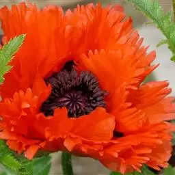 一年生草本,高50-100cm,全体被毛,茎分枝。 叶质较薄,叶羽状深裂或全裂,裂片披针形,边缘有不规则的锯齿。 花径5 -6cm,花瓣红色,有复色、间色、复瓣和重瓣品种。基部常具深紫色斑点,花丝紫红或深紫色。 蒴果宽倒卵形,长1-2.2cm。