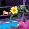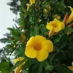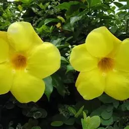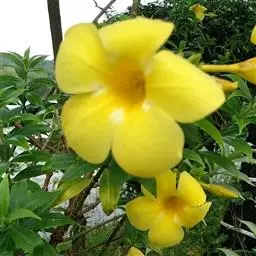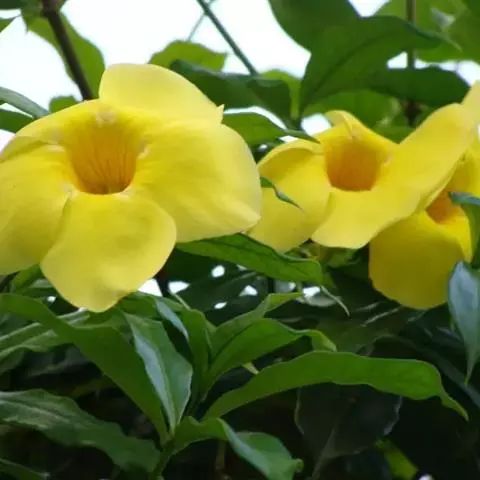 大花软枝黄蝉(Allemanda cathartica Linn. var. hendersonii)是软枝黄蝉的一个变种,夹竹桃科黄蝉属植物。藤状灌木,长达4米,枝条软弯垂,具白色乳汁。叶纸质,椭圆形、卵圆形或倒卵形,花序着花4-5朵,花冠比原变种大形,橙黄色,花冠喉部具5个发亮的斑点,花期春夏两季为盛,有时秋季亦能开花,果期冬季至翌年春季。大花软枝黄蝉原产于南美洲的乌拉圭,现广植于热带和亚热带地区。大花软枝黄蝉喜高温多湿、阳光充足的气候条件,喜肥沃、排水良好的酸性土壤。大花软枝黄蝉的花橙黄色,大而美丽,供观赏用。