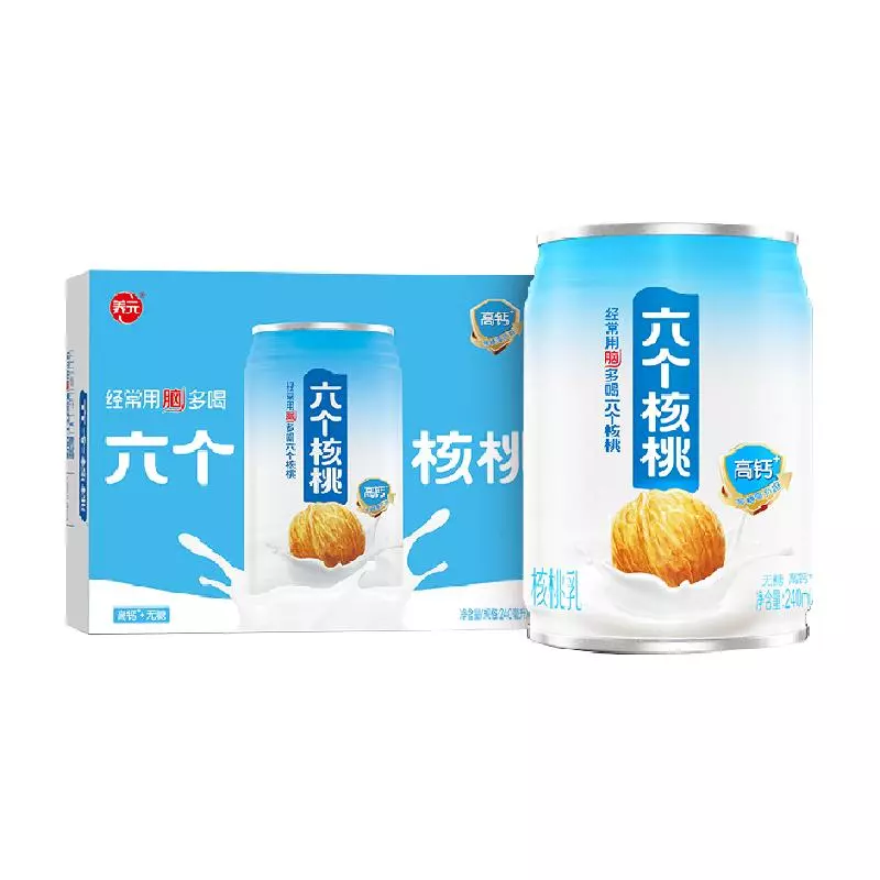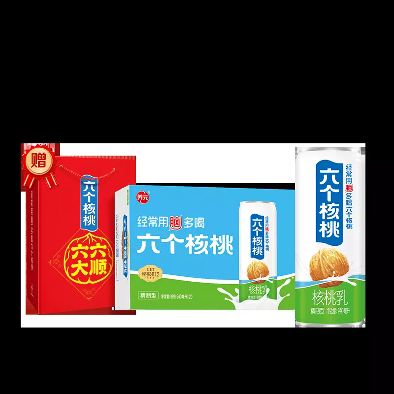 六个核桃是河北养元智汇饮品股份有限公司推出的一款核桃乳饮品,口感醇香,因富含对大脑有益的不饱和脂肪酸而深得消费者青睐,是植物蛋白饮料行业的领军品牌。六个核桃运用独创的【5·3·28】核桃乳生产工艺,有效地解决了核桃本身营养不易吸收、携带不便、口感涩腻的问题