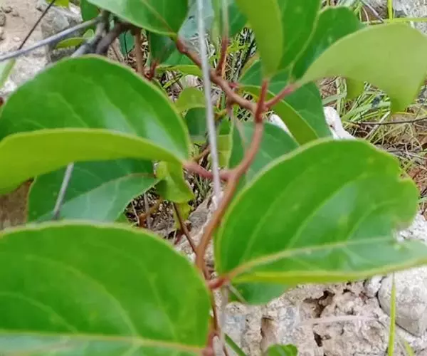 常绿藤本,幼枝褐色,或红棕色,有时被柔毛,小枝无毛,皮孔圆形,稀疏或密布,髓实心,白色;冬芽圆锥形,长2.5毫米,最外两枚芽鳞片特化成三角形刺,以后增大,长可达5毫米。叶片近革质,椭圆形或宽卵状椭圆形,先端急尖,基部楔形或圆形,边缘具疏细锯齿,近基部全缘,侧脉4~5对,网脉不明显,无毛,叶柄长6-2毫米。