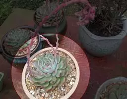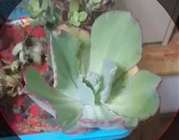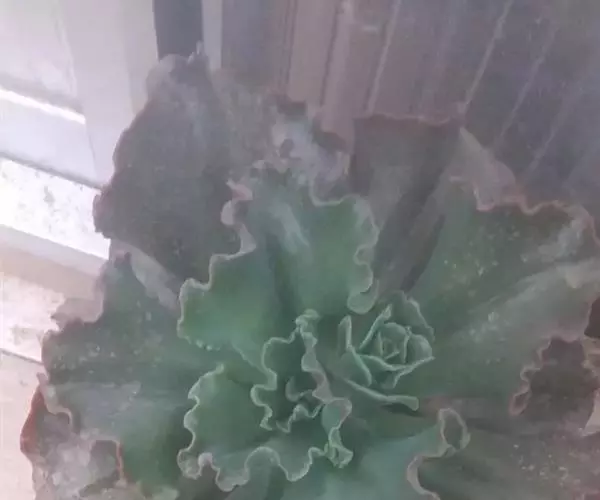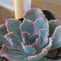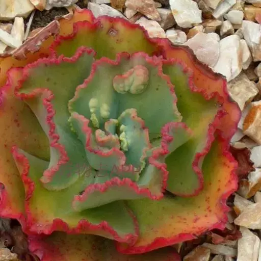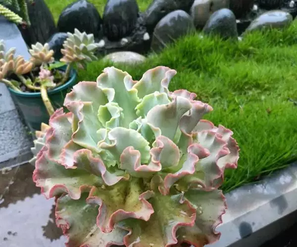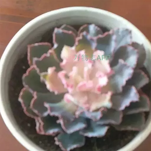 叶色翠绿至红褐,新叶色浅、老叶色深,强光与昼夜温差大或冬季低温期叶色深红,弱光则叶色浅绿,叶缘呈大波浪状,常会显现紫红色。新叶有薄霜粉覆盖。 偶有侧芽。聚伞花序,长50~100厘米,花通常呈粉色。 [1-2]