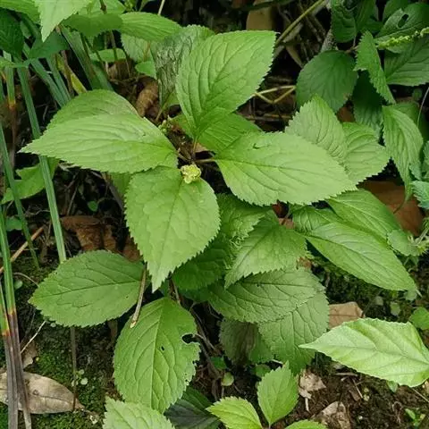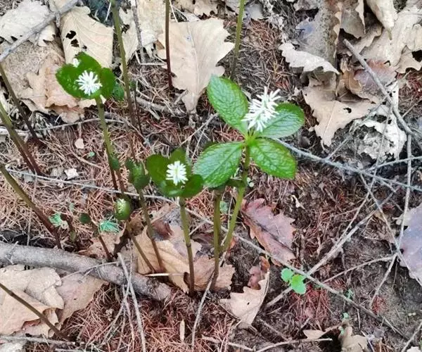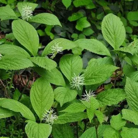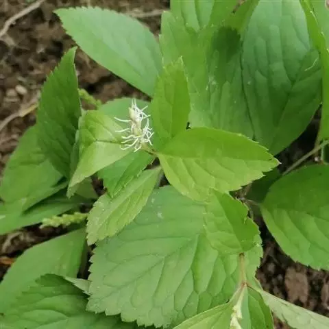 多年生草本,高20-49厘米;根状茎多节,横走,分枝,生多数细长须根,有香气;茎直立,单生或数个 中医中药材 丛生,不分枝,下部节上对生2片鳞状叶。叶对生,通常4片生于茎顶,成假轮生,纸质,宽椭圆形或倒卵形,长8-14厘米,宽5-8厘米,顶端急尖,基部宽楔形,边缘有齿牙状锐锯齿,齿尖有一腺体,近基部或1/4以下全缘,腹面有光泽,两面无毛,侧脉6-8对,网脉明显;叶柄长8-18毫米;鳞状叶膜质,三角形或宽卵形,长4-5毫米。穗状花序单一,顶生,连总花梗长3-5厘米;苞片三角形或近半圆形;花白色;雄蕊3枚,药隔基部连合,着生于子房上部外侧;中央药隔无花药,两侧药隔各有1个1室的花药;药隔延伸成线形,长约5毫米,水平伸展或向上弯,药室在药隔的基部;子房卵形,无花柱,柱头截平。核果近球形或倒卵形,长2.5-3毫米,具长1-1.5毫米的柄,绿色。花期4-5月,果期5-7月。