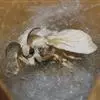 桑蚕 熟蚕吐丝毕,体躯缩小略呈纺锤形,静止不动,这时称潜蛹(预蛹)。潜蛹是真皮层与旧幼虫表皮分离并形成蛹表皮的时期,约需2日。化蛹蜕皮是蜕皮激素作用的结果。刚蜕皮的蛹呈纺锤形,乳白色,后转深褐色。蛹体分头、胸、腹3部分。雌蛹腹部大而末端钝圆,第8腹节腹面正中线上有1条纵线;雄蛹腹部小而末端尖,在第9腹节腹面中央有1褐色小点(图3)。一般蛹体重1.5~2.5克。蛹期体内剧烈地进行着幼虫组织器官的破坏,成虫组织器官的发生、形成,以及生殖细胞的发育、成熟等生理过程。化蛹后约14日完成成虫发育,这时由脑神经分泌细胞合成并贮存在咽侧体内的羽化激素,因光的刺激而分泌至血液中,约40分钟后蛹便羽化。