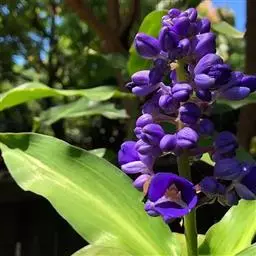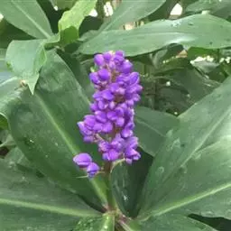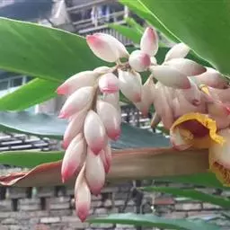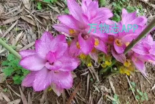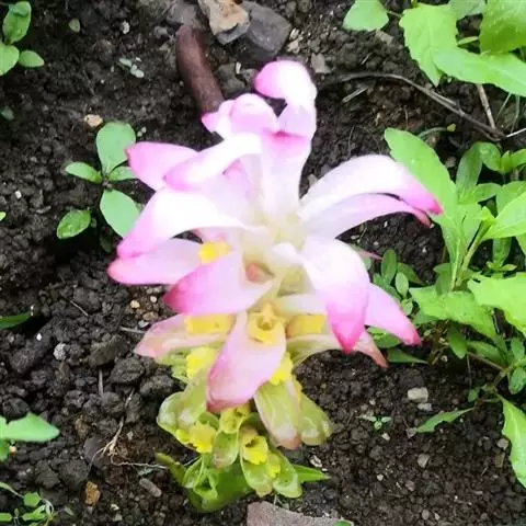 花葶由根茎单独发出,常先叶而生,长10-20厘米,被疏松、细长的鳞片状鞘数枚;穗状花序阔椭圆形,长10-18厘米,宽5-8厘米;苞片卵形至倒卵形,稍开展,顶端钝,下部的绿色,顶端红色,上部的较长而紫色;花萼长1-1.2厘米,白色,顶端3裂;花冠管长2-2.5厘米,裂片长圆形,黄色,不相等,后方的1片较大,长1.5-2厘米,顶端具小尖头;侧生退化雄蕊比唇瓣小;唇瓣黄色,近倒卵形,长约2厘米,宽1.2-1.5厘米,顶端微缺;花药长约4毫米,药隔基部具叉开的距;子房无毛。花期:4-6月。
