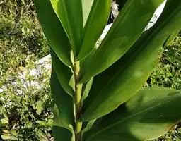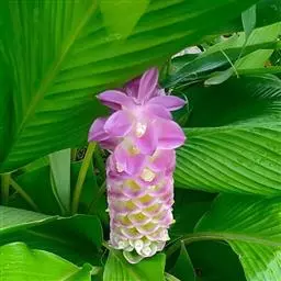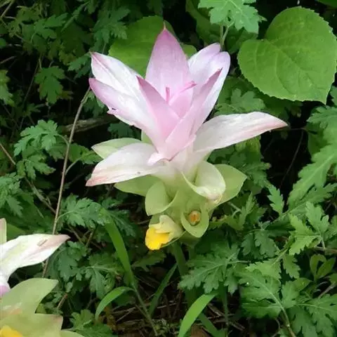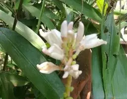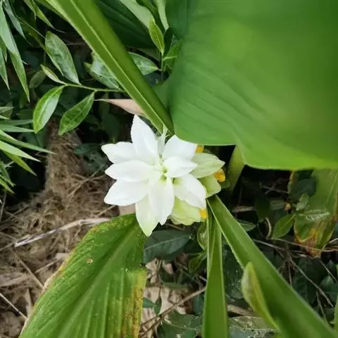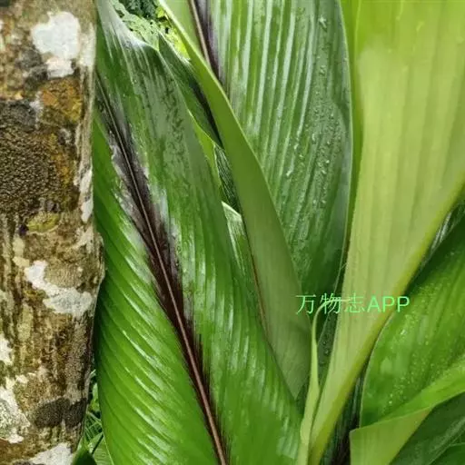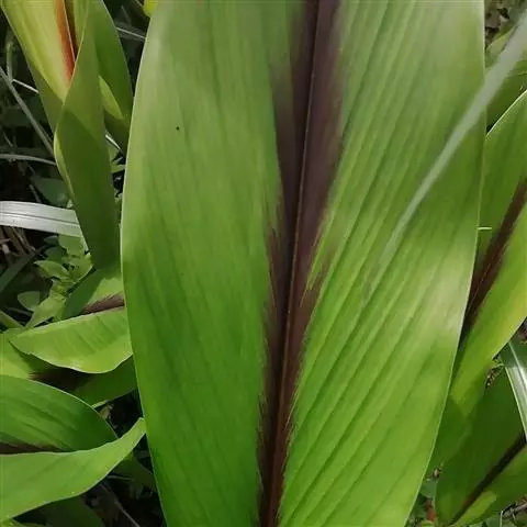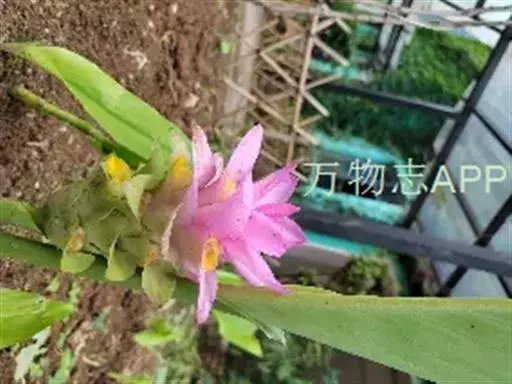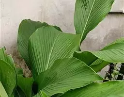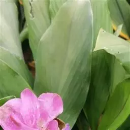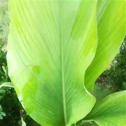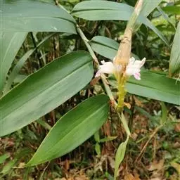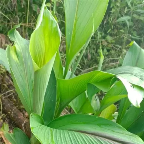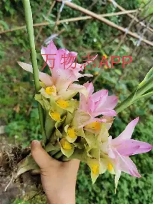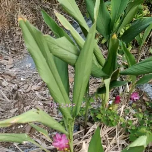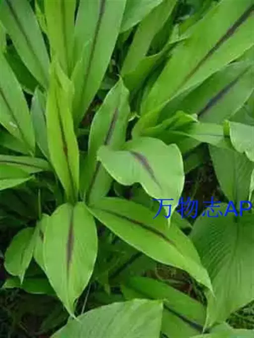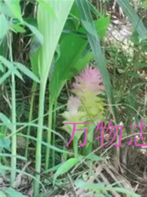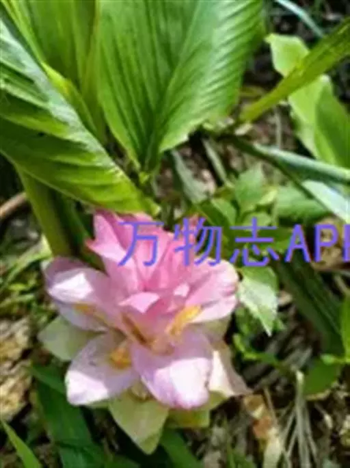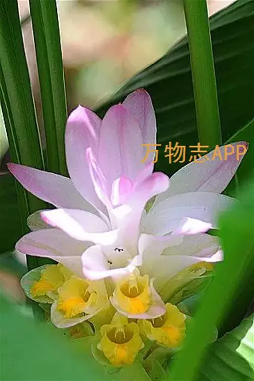 株高约1米;根茎圆柱形,肉质,具樟脑般香味,淡黄色 莪术花 或白色;根细长或末端膨大成块根。叶直立,椭圆状长圆形至长圆状披针形,长25-35(60)厘米,宽10-15厘米,中部常有紫斑,无毛;叶柄较叶片为长。