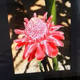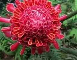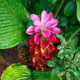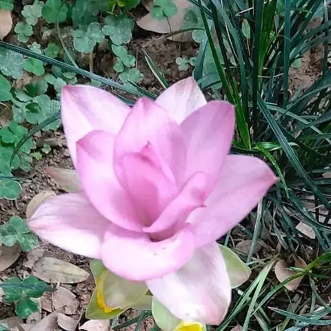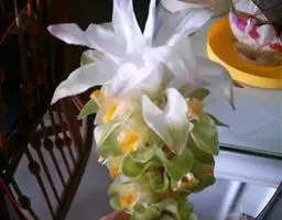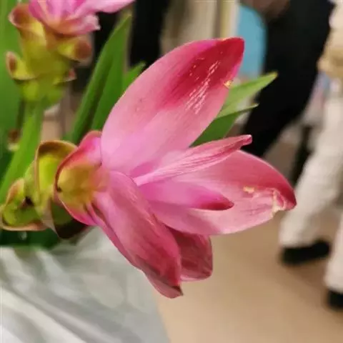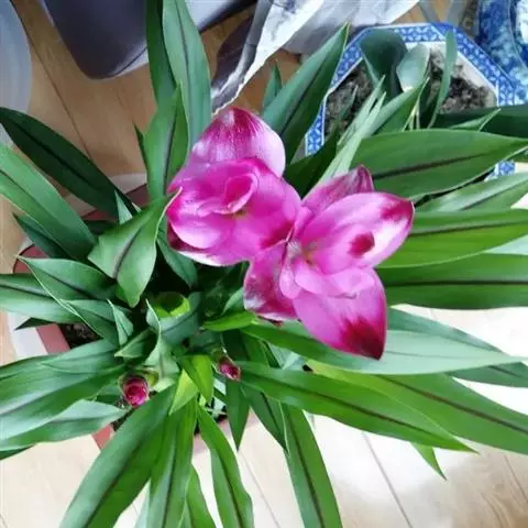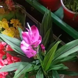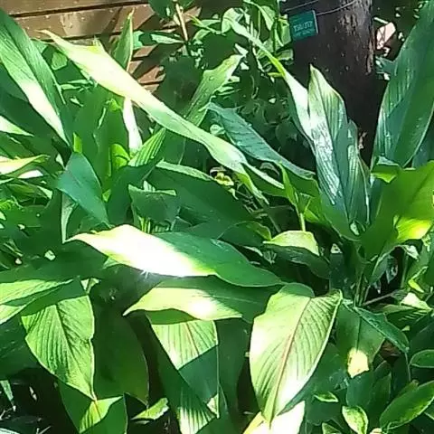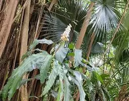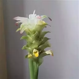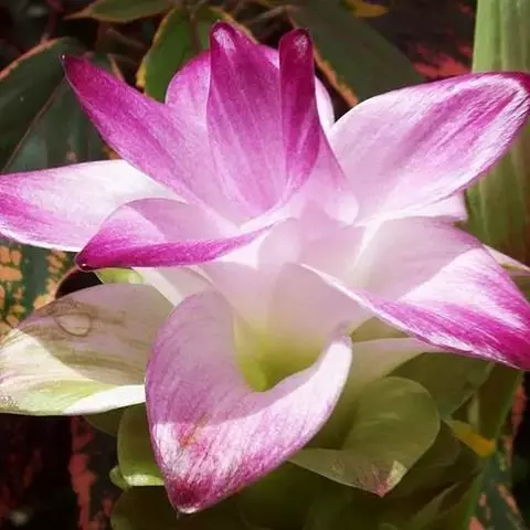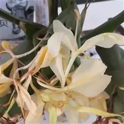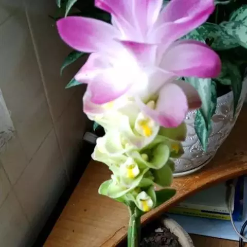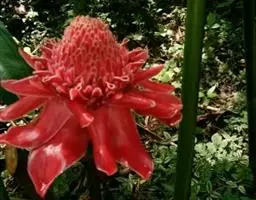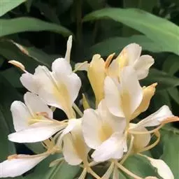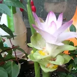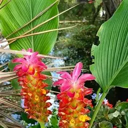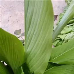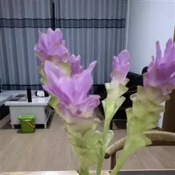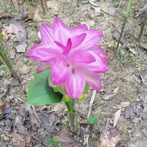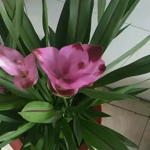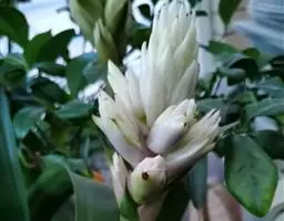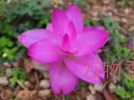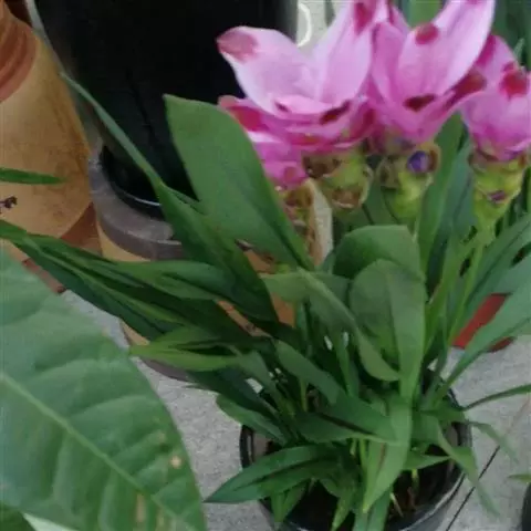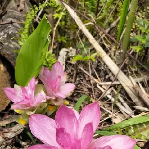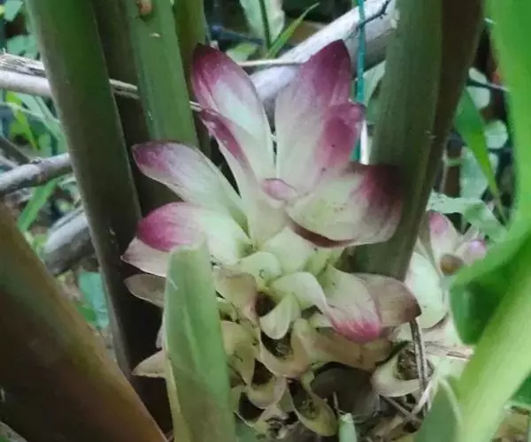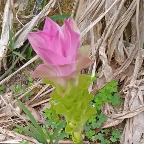 株高约1米;根茎圆柱形,肉质,具樟脑般香味,淡黄色 莪术花 或白色;根细长或末端膨大成块根。叶直立,椭圆状长圆形至长圆状披针形,长25-35(60)厘米,宽10-15厘米,中部常有紫斑,无毛;叶柄较叶片为长。