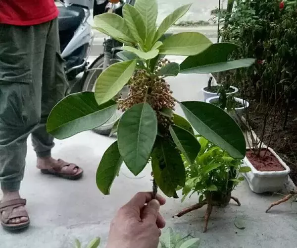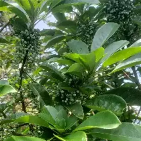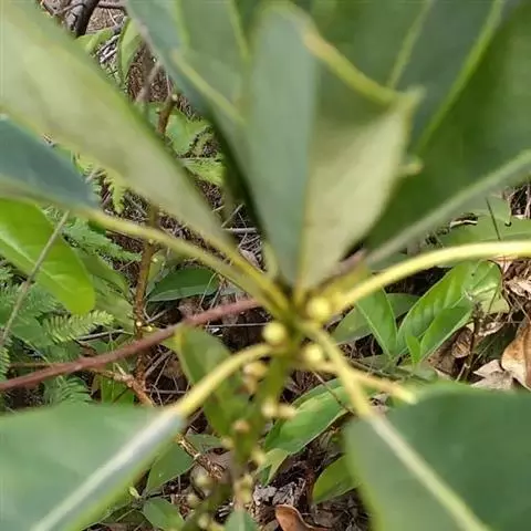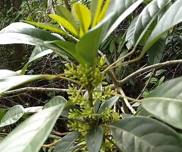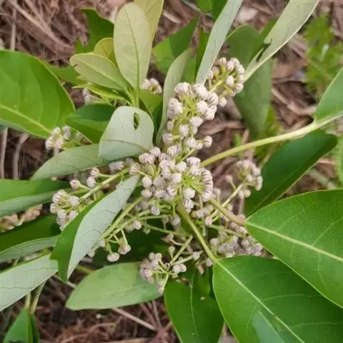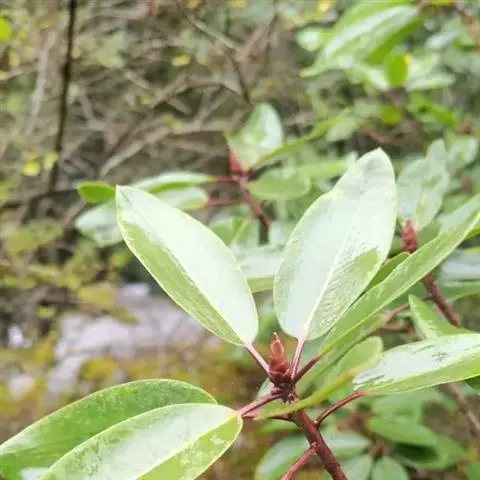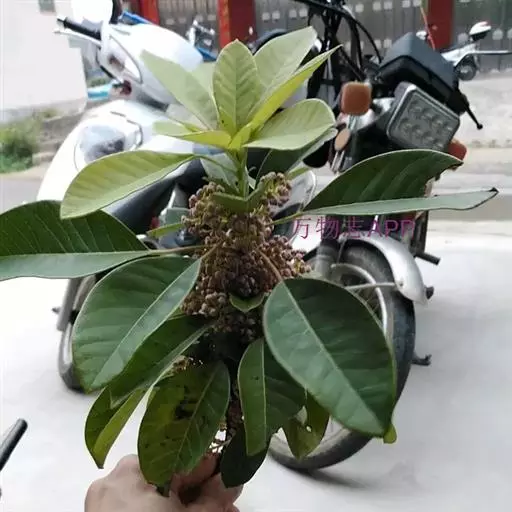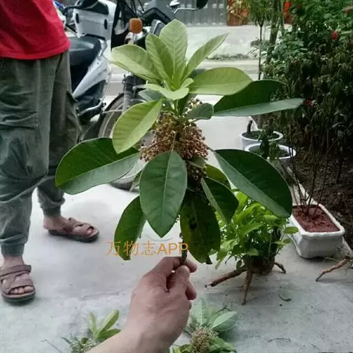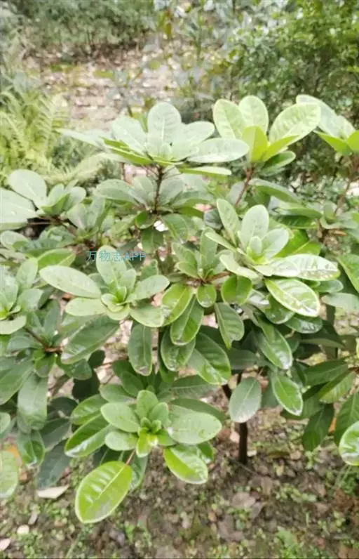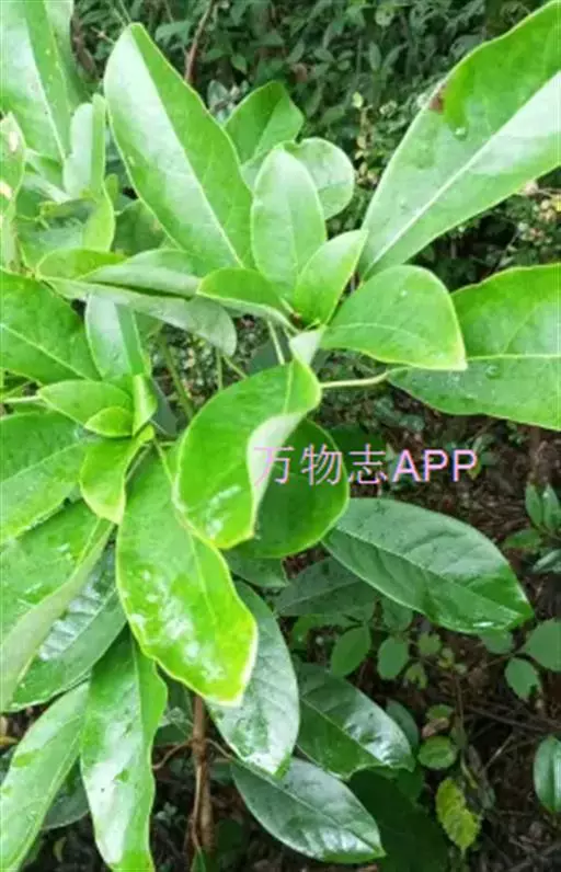 灌木,高1.5-4米;小枝灰褐色,径3-5毫米,具稀疏皮孔。叶纸质,阔椭圆形或倒卵形,长12-16厘米,宽4-9厘米,先端钝或圆形,具短尖头,基部阔楔形,全缘,略反卷,干后两面绿色,叶面具光泽,叶背多少被白粉,具细小乳突体,侧脉8-11对,在叶面清晰,叶背突起;叶柄长4-8厘米,上面平或略具槽,径约2毫米。总状花序腋生,长2-3厘米,雄花花梗长8-10毫米;花萼盘状,径约4毫米,3-4浅裂,裂片阔三角形;雄蕊9-10枚,长约3毫米,花药长圆形,侧向压扁,药隔发达伸长,先端内弯,花丝极短;雌花花梗长5-6毫米;苞片卵形,长约3毫米;萼片3-4,阔三角形,长约1.5毫米;子房椭圆形,长1.5-2毫米,花柱短,柱头2,直立,先端外弯。果序长4-5厘米,密集排列;果卵圆形,较小,长约7毫米,被白粉,具小疣状突起,先端具宿存柱头,基部具宿萼。花期4-6月,果期8-11月。