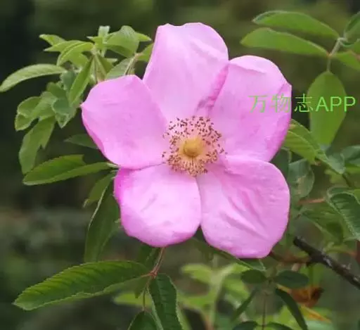 花直径3-4cm;萼筒近圆形,光滑无毛,萼片披针形,先端扩展成叶状,边缘有不整齐锯齿和腺毛,下面有稀疏柔毛和腺毛,上面被柔毛,边缘较密;花瓣粉红色,倒卵形,先端不平整,基部宽楔形;花柱离生,被毛,比雄蕊短很多。