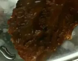1.将油放入锅里,加热至100℃时放入解冻好的腌制猪颈肉,炸至6分钟左右,表皮金黄色捞起沥油。