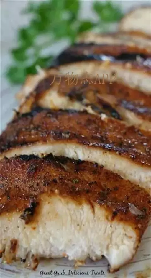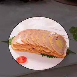 3、将腌好的猪颈肉放入烤炉中小火烤30分钟至熟,取出切成厚0.5厘米的片,摆在垫有生菜