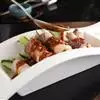 3.将炸好的猪颈肉切片,摆在生菜丝上面用柠檬点缀鲜花装饰即可。