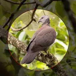 斑尾鹃鸠体长38厘米,是体大而尾长的褐色鹃鸠。背及尾满布黑色或褐色横斑。头灰,颈背呈亮蓝绿色。胸偏粉,…