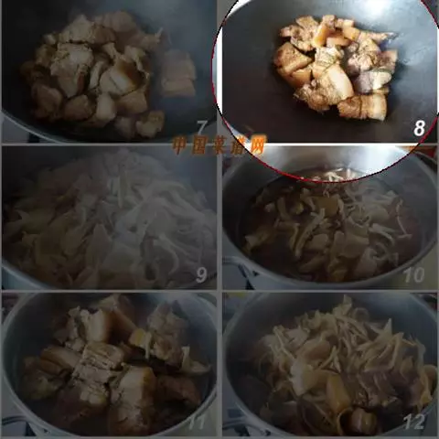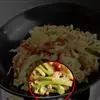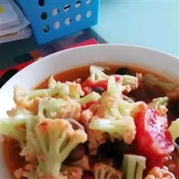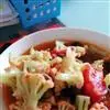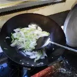 4、然后倒入菜花、高汤翻炒均匀,可少许加上肉片,再加上少许清水,煮8分钟左右;