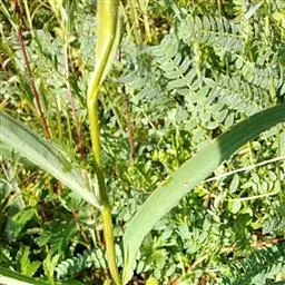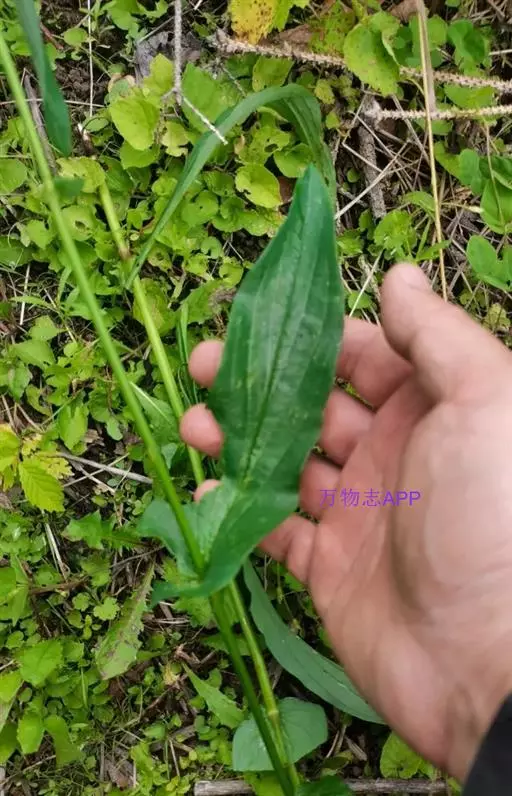 叶大形,稍稀疏,表面鲜绿色,背面带粉兰绿色,基生叶广卵形到椭圆形或披针形,顶端急尖或渐尖,下部楔形或广楔形,并收缩成宽扁有翼的长叶柄,至基部又扩大成叶鞘抱茎,叶片长8-17厘米,宽2.5-5(8)厘米,9-11脉;叶柄常带紫色,长8-12厘米;茎中部叶无柄,卵形或狭卵形,7-9脉;茎上部叶渐小,卵形或广披针形,9-11脉,顶端渐尖,基部心形,抱茎。