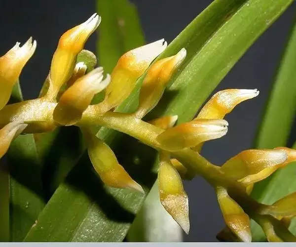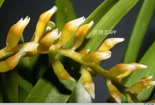 花被长2-3厘米,基部膨大呈球形,直径达6毫米,向上收狭呈一长管,管长约1.4厘米,绿色,外面无毛,内面具腺体状毛,管口扩大呈漏斗状;檐部一侧极短,有时边缘下翻或稍二裂,另一侧渐扩大成舌片;舌片卵状披针形,顶端长渐尖具延伸成1-3厘米线形而弯扭的尾尖,黄绿色,常具紫色纵脉和网纹;花药长圆形,贴生于合蕊柱近基部,并单个与其裂片对生;