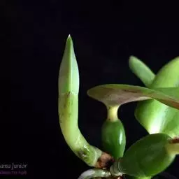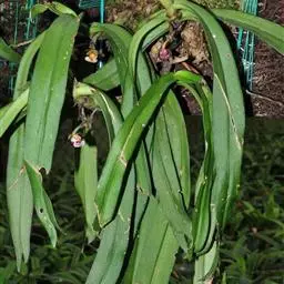 栗鳞贝母兰根状茎粗壮,坚硬,粗7-8毫米,密被紫褐色的革质鞘。假鳞茎在根状茎上通常相距2-3厘米,长圆形或近圆柱形,向顶端稍变狭,长6-12.5厘米,粗1.5-3.2厘米,干后亮黄色,顶端生2枚叶,基部具数枚鞘;鞘干后如竹箨,长5-8厘米,宽2.5-3厘米,背面具紫褐色斑块,仅上端与边缘无斑。叶革质,长圆状披针形至椭圆状披针形,长13-19厘米,宽3-4.5厘米,先端近渐尖或略呈短尾状,基部收狭为柄;叶柄长4.5-8厘米。