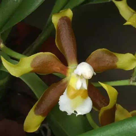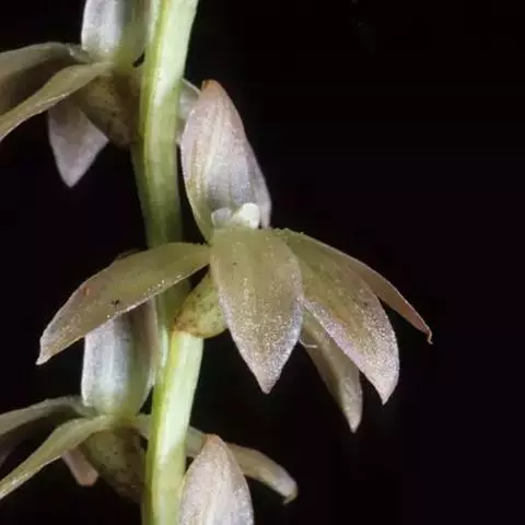 花葶连同幼嫩的假鳞茎和叶从靠近老假鳞基部的根状茎上发出,长16-32厘米,下半部为鞘所包;总状花序长11-21厘米,疏生8-10朵花;花苞片倒卵状椭圆形,长约2.5厘米,早落;花梗和子房长1.7-2厘米;花浅黄色至白色,唇瓣上有黄色和浅褐色斑;中萼片长圆形或长圆状披针形,长2.1-2.4厘米,宽6-7毫米;侧萼片稍狭,背面多少有龙骨状脊。