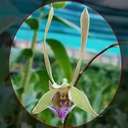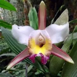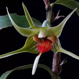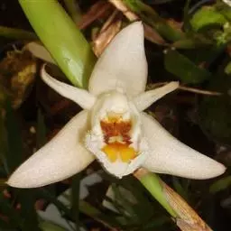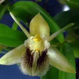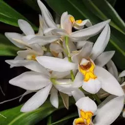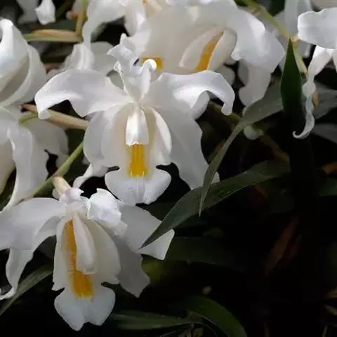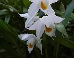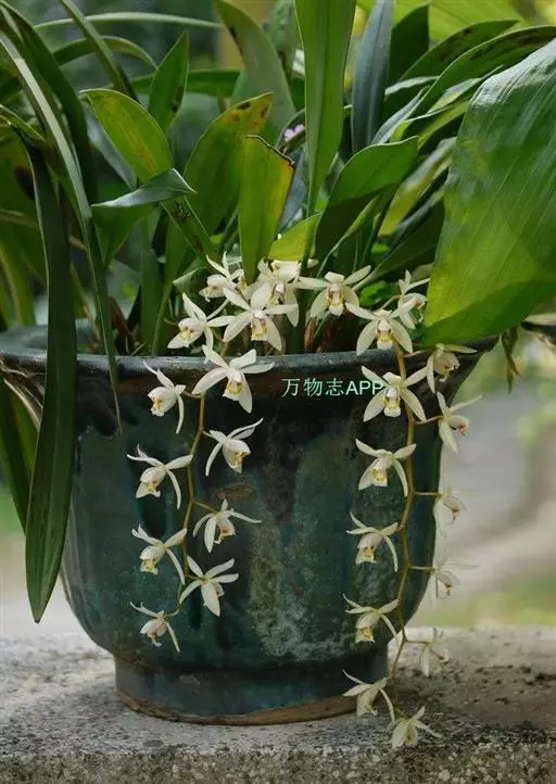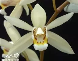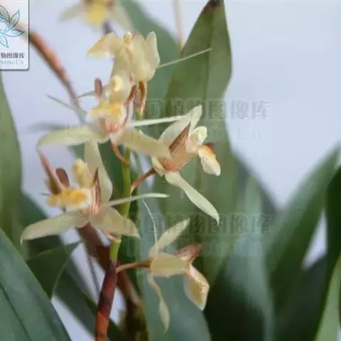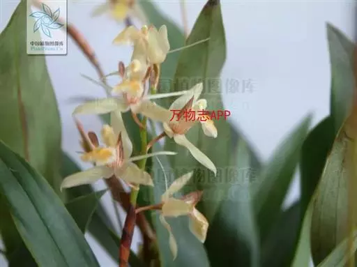 栗鳞贝母兰(学名:Coelogyne flaccida Lindl.):根状茎粗壮,坚硬,粗7-8毫米,密被紫褐色的革质鞘。假鳞茎在根状茎上通常相距2-3厘米,长圆形或近圆柱形,向顶端稍变狭,顶端生2枚叶。叶革质,长圆状披针形至椭圆状披针形。花葶连同幼嫩的假鳞茎和叶从靠近老假鳞基部的根状茎上发出;总状花序长11-21厘米,疏生8-10朵花;花浅黄色至白色,唇瓣上有黄色和浅褐色斑;花瓣线状披针形,略短于萼片,宽2-3毫米;唇瓣近卵形,长1.6-2厘米,宽约1.5厘米,3裂。花期3月。