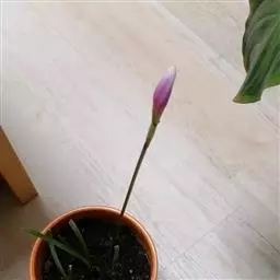 花单生于花茎顶端,下有佛焰苞状总苞,总苞片常带淡紫红色,长4-5cm,下部合生成管;花梗长2-3cm;花玫瑰红色或粉红色;花被管长1-2.5cm,花被裂6片,裂片倒卵形,顶端略尖,长3-6cm;雄蕊6,长约为花被的2/3-4/5,花药丁字形着生;子房下位,3室,胚珠多数,花柱细长,柱头深3裂。蒴果近球形;种子黑色。花期春夏秋。