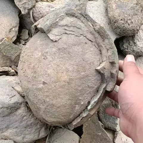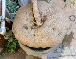 本品为不规则的块状,直径2~7cm,厚0.2~1.5cm。外皮暗褐色,有皱纹及须根痕。切面类白色或灰白色,可见筋脉纹(维管束),有的略呈环状排列。质硬而脆,易折断,断面显粉性。