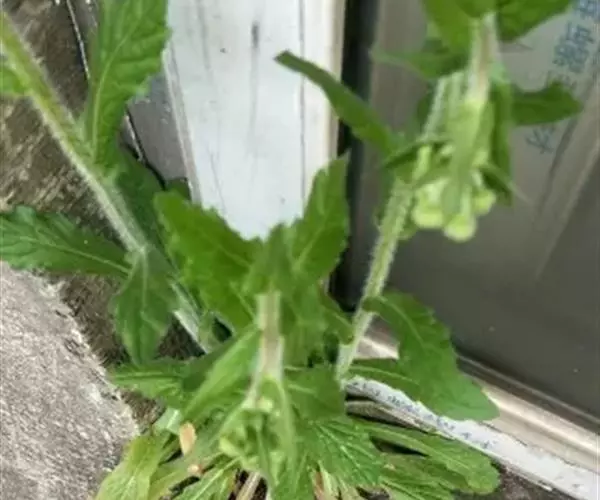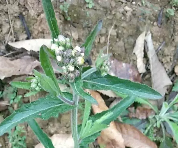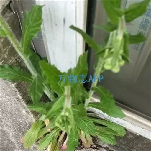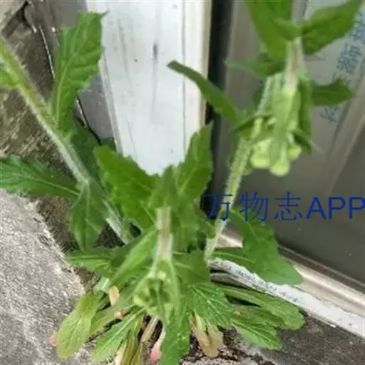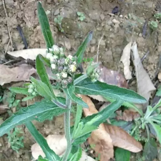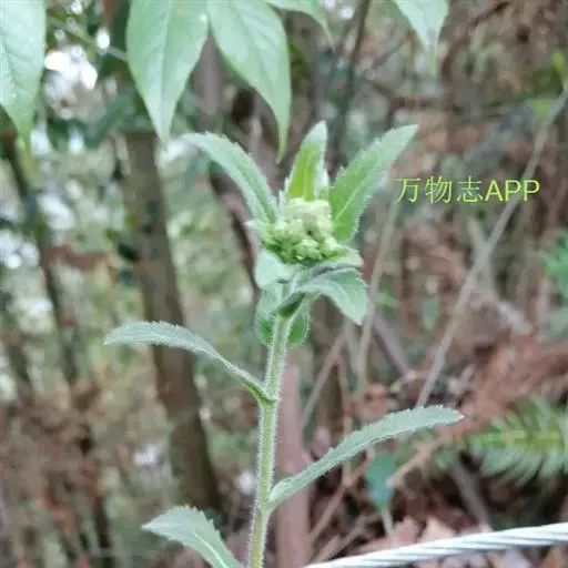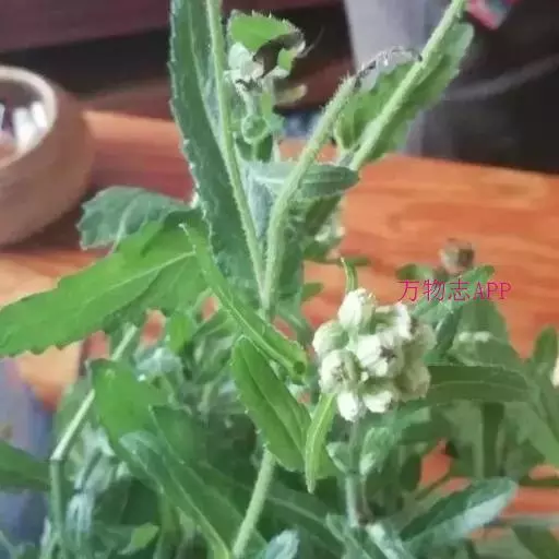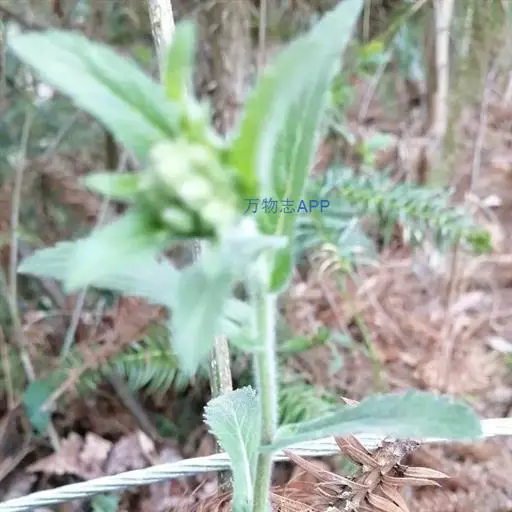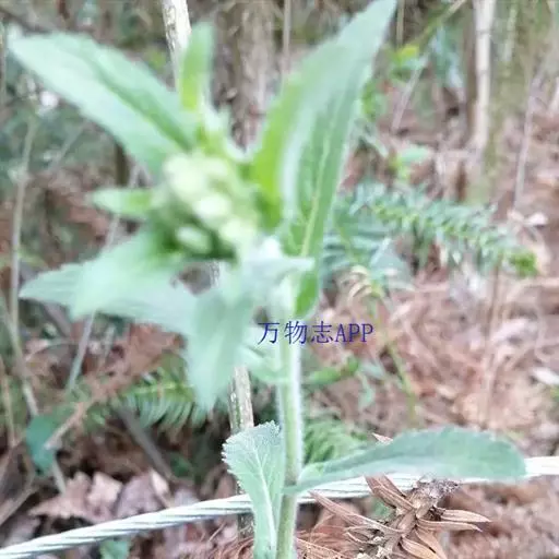 叶通常密集于茎较下部,呈莲座状,基部叶倒卵形或匙形,顶端圆形,基部长渐狭,长6-7厘米,较下部叶有长柄,长3-13厘米,叶片长圆形或椭圆状长圆形,或倒披针形,顶端圆形,基部楔形,常下延成具宽翅的柄,边缘有圆齿或粗锯齿,有4-5对侧脉,在下面明显,两面被白色长柔毛;中部叶疏生,倒披针状长圆形或长圆状披针形,无柄,长3.5-5厘米,宽5-15毫米,顶端钝,基部宽而半抱茎,边缘有小尖齿,上部叶渐小,披针形或线状披针形,两面被长贴毛。