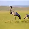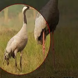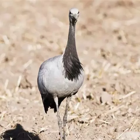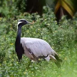 蓑羽鹤大型涉禽,体长68~92厘米,是鹤类中个体最小者。通体蓝灰色,眼先、头侧、喉和前颈黑色,…