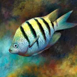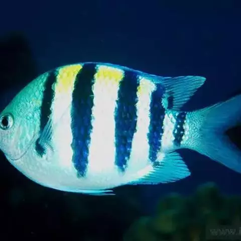 分布于印度洋中的珊瑚礁海域,属雀鲷科,体长10~15cm,椭圆形。全身紫黑色,体侧在眼睛后、背鳍中间、尾柄处有三条银白色垂直环带,嘴部银白色,经眼睛有一条黑带。饲养水温26~27℃,海水比重1.022~1.023,海水ph值8.0~8.5之间,水硬度7~9度dh。水质要求澄清,饵料有丰年虾、鱼虫、切碎的鱼虾肉、海水鱼颗粒饲料等。喜欢躲在花朵般的海葵触手中。