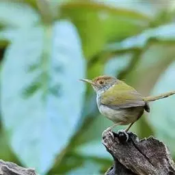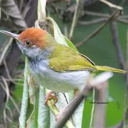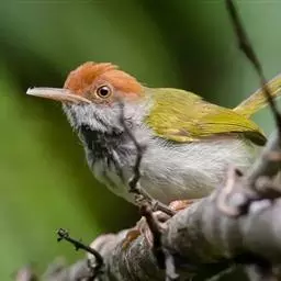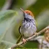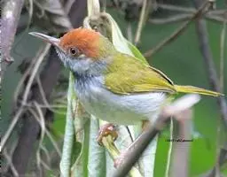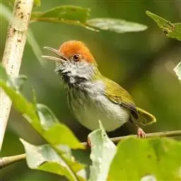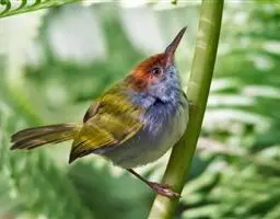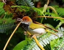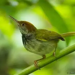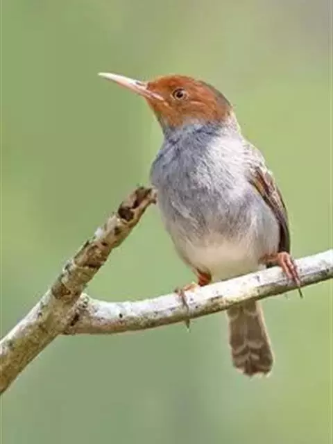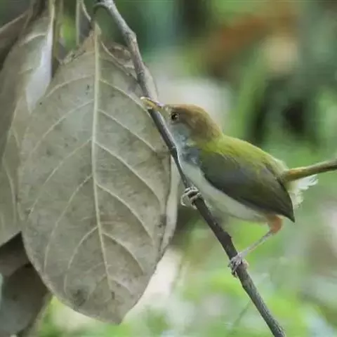 黑喉缝叶莺:体长11.5厘米,是一种小型的顶冠棕色、腹部白色的莺。尾甚长而常上翘,臀黄色,…