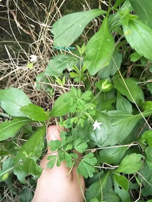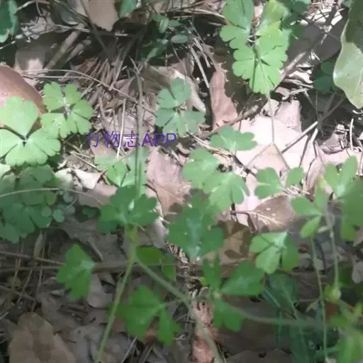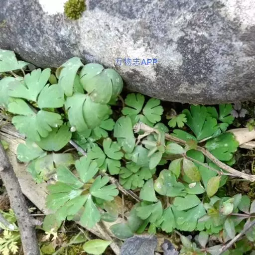 基生叶多数,为掌状三出复叶;叶片轮廓卵圆形至肾形,长1.2-3厘米;小叶扇状菱形或倒卵状菱形,长0.6-2.5厘米,宽1-2.8厘米,三深裂,深裂片又有2-3个小裂片,两面均无毛;叶柄长3-12厘米,基部扩大呈鞘状。茎生叶与基生叶相似,惟较小。