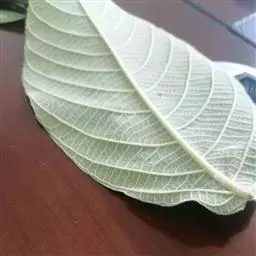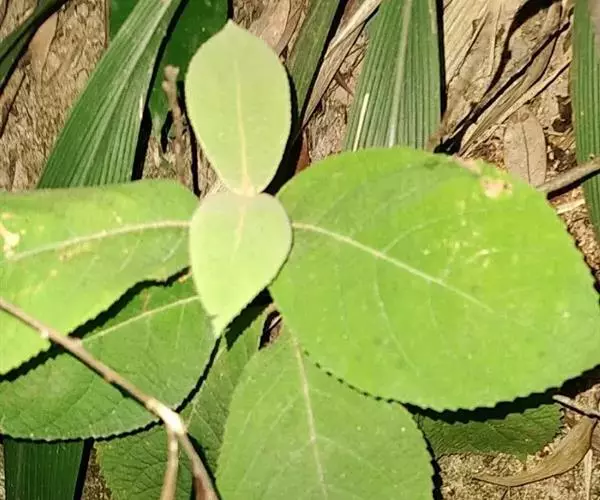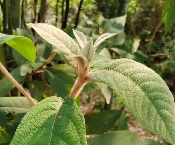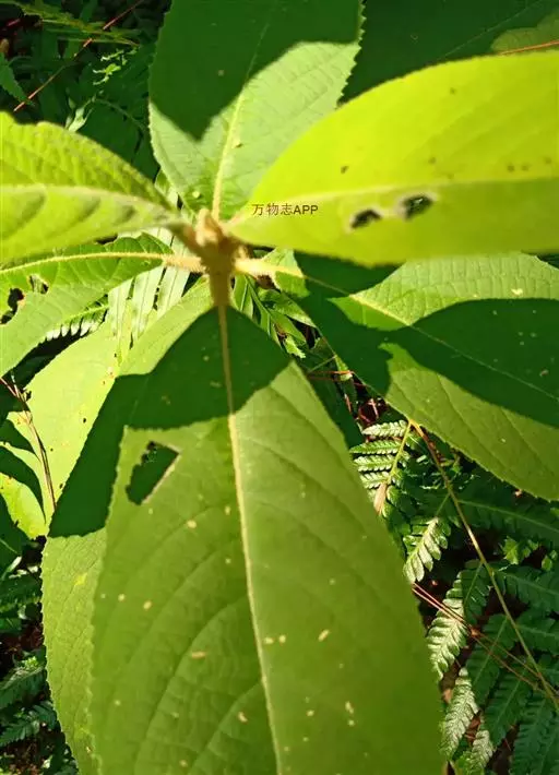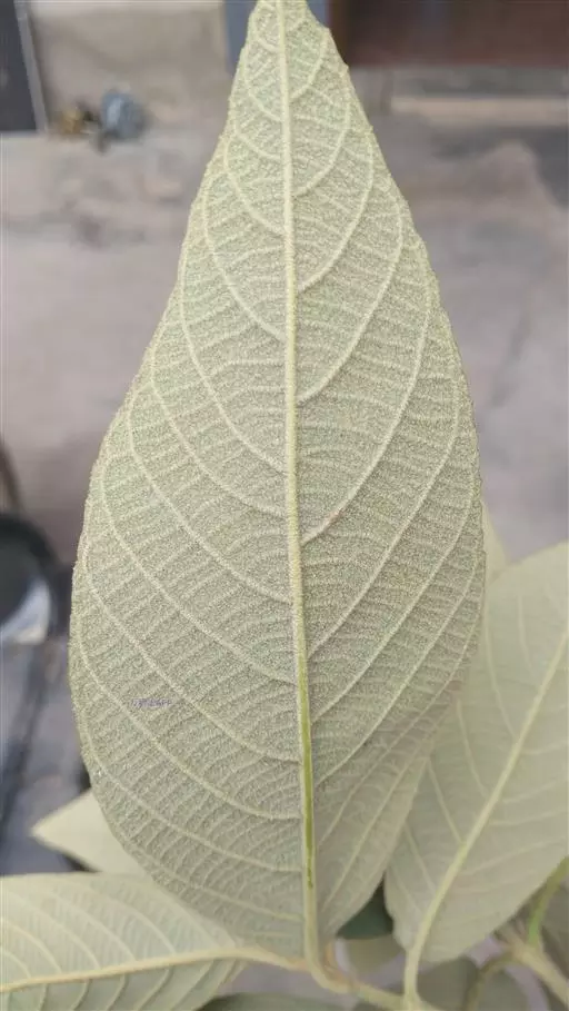 叶片长椭圆形、卵状椭圆形或长椭圆状披针形,长12-22厘米,宽4-8厘米,顶端渐尖或锐尖,基部楔形,边缘有锯齿,表面无毛或疏被毛,通常脉上较密,背面密生黄褐色星状毛和分枝茸毛,两面被不明显的黄色腺点,侧脉10-18对,在叶背隆起;叶柄长1-3厘米。