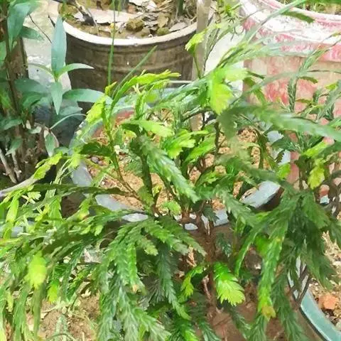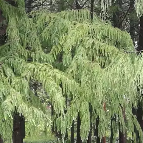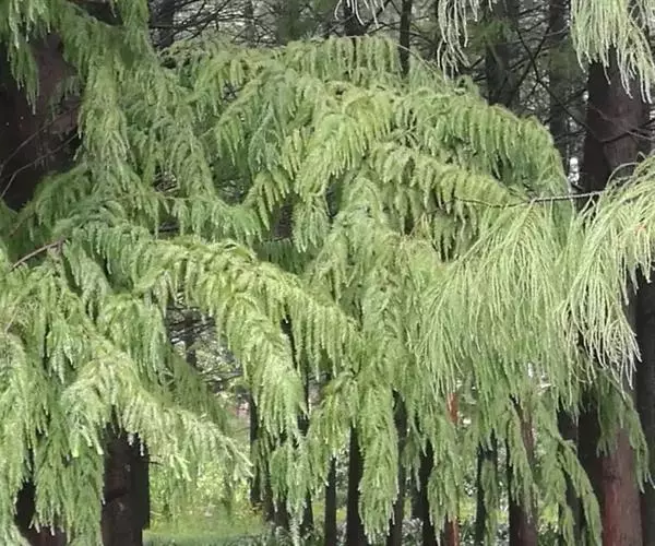 半常绿或常绿乔木,在原产地高达50米,胸径可达4米;树干尖削度大,基部膨大;树皮裂成长条片脱落;枝条水平开展,形成宽圆锥形树冠,大树的小枝微下垂;生叶的侧生小枝螺旋状散生,不呈二列。叶条形,扁平,排列紧密,列成二列,呈羽状,通常在一个平面上,长约1厘米,宽1毫米,向上逐渐变短。雄球花卵圆形,近无梗,组成圆锥花序状。球果卵圆形。