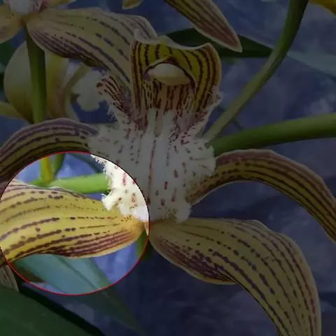 花瓣狭椭圆形或狭卵状椭圆形,长1.5-2.4厘米,宽5-8毫米,近平展;唇瓣近卵形,长1.5-2.3厘米,略3裂;侧裂片直立,多少围抱蕊柱,上面有小乳突;中裂片较大,卵形,外弯,边缘波状,亦具小乳突;唇盘上2条纵褶片从基部延伸至中裂片基部,上半部向内倾斜并靠合,形成短管;蕊柱长1-1.4厘米,稍向前弯曲,两侧具狭翅;花粉团4个,成2对,宽卵形。