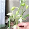 苗木处理:兰株起苗后,冲洗根群上的泥沙,拆去无叶假鳞茎,剪除病残叶片和朽根。种植前,种苗用托布津或可杀得2000倍稀释浸泡半小时,后捞起清水冲洗干净,放于通风处,凉干水分待栽。