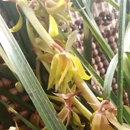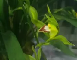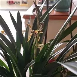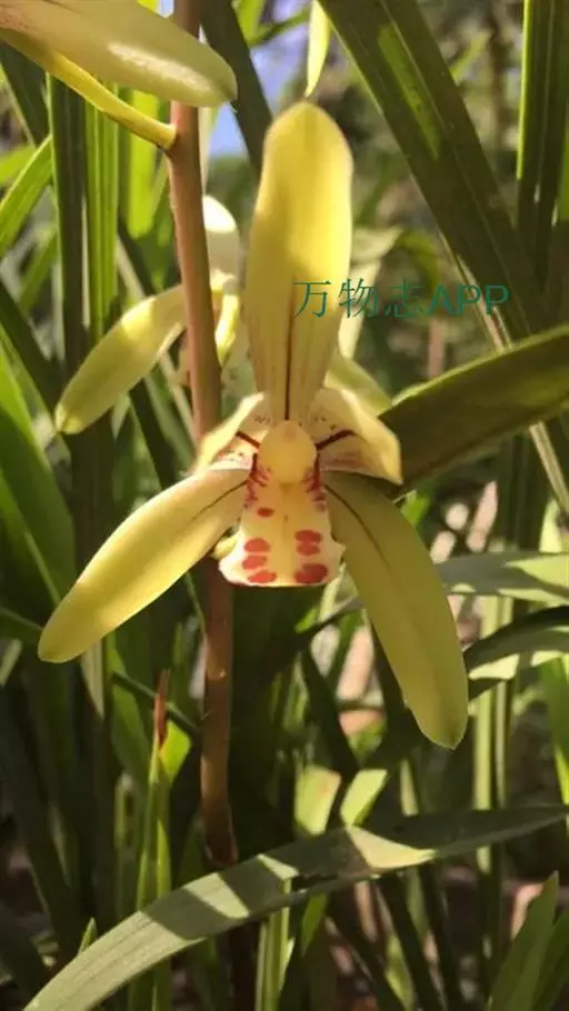 建兰(学名:Cymbidium ensifolium (L. ) Sw.):地生植物;假鳞茎卵球形,包藏于叶基之内。叶2--6枚,带形,有光泽,长30-60厘米,宽1-2.5厘米。花葶从假鳞茎基部发出,直立,一般短于叶;总状花序具3-9朵花;花常有香气,色泽变化较大,通常为浅黄绿色而具紫斑;萼片近狭长圆形或狭椭圆形;花瓣狭椭圆形或狭卵状椭圆形,长1.5-2.4厘米,宽5-8毫米,近平展;唇瓣近卵形,长1.5-2.3厘米,略3裂。蒴果狭椭圆形,长5-6厘米,宽约2厘米。花期通常为6-10月。