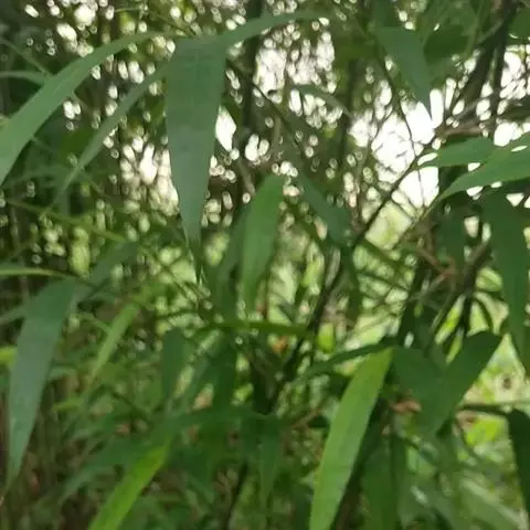 末级小枝具2-5叶;叶鞘革质,光滑无毛,具纵肋,在背部上方近于具脊,外缘生纤毛;鞘口繸毛直立,平滑,易落;叶舌低矮,截形,边缘生细纤毛,背面生有小刺毛;叶片薄纸质,长椭圆状披针形,长8-29厘米,宽1-2.7厘米,先端锐尖,基部收缩为一长约1.8毫米的叶柄,叶片上表面无毛,下表面初被柔毛,后变为无毛,次脉4-7对,再次脉为5-7条。