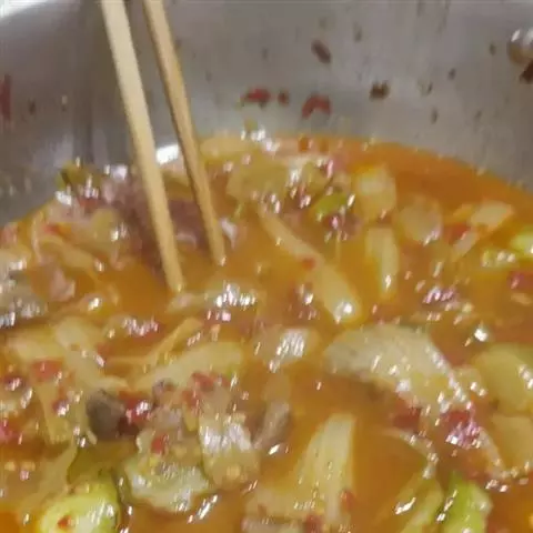 1.锅内放油,小火炒香花椒和一个小辣椒后捞出丢弃。
