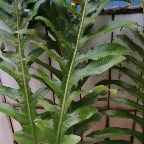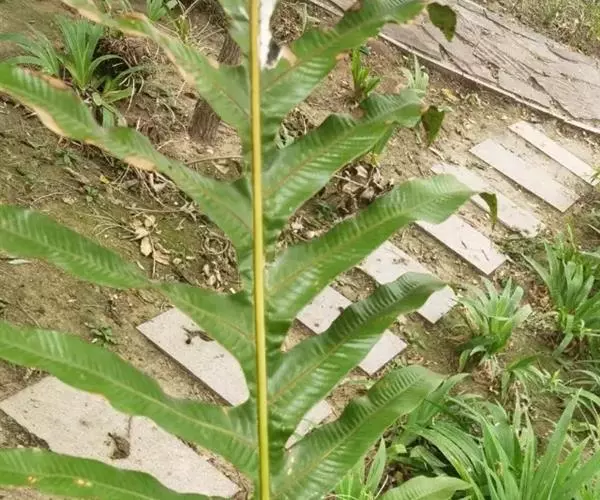 叶一型,长圆状倒披针形,长80-120厘米或过之,中部宽20-30厘米,顶端渐尖,向下渐变狭,至下约1/4处狭缩成宽1-2厘米的翅,至基部又渐扩张成膨大的圆心脏形,宽约15-25厘米,有宽缺刻或浅裂的边缘,基部以上叶片为羽状深裂,再向上几乎深裂到叶轴;裂片多数,斜展或略斜向上,被圆形的缺刻所分开,披针形,中部的裂片长达15-22厘米,宽2-3厘米,急尖头或圆头,为阔圆形的缺刻所分开;叶脉粗而很明显,侧脉斜展,隆起,通直,相距4-5毫米,向外达于加厚的边缘,横脉与侧脉直角相交,成一回网眼,再分割一次成3个长方形的小网眼,内有顶端成棒状的分叉小脉;叶硬革质,两面均无毛,干后硬而有光泽,裂片往往从关节处脱落。孢子囊群位于小脉交叉处,叶片下半部通常不育,4-6个生于侧脉之间,但并不位于正中央,而是略偏近下脉,每一网眼内有1个孢子囊群,在主脉与叶缘间排成一长行,圆球形或长圆形,分离,但成熟后常多少汇合成一连贯的囊群线。
