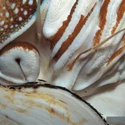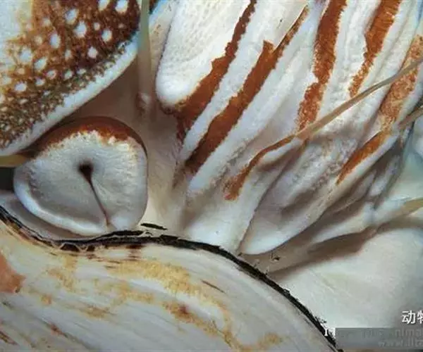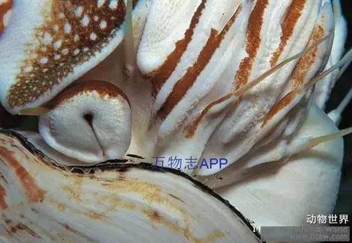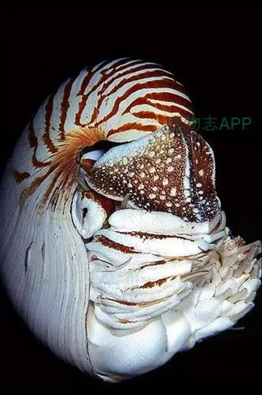 螺壳构造 其外壳呈螺旋形,贝壳弯曲,在平面上作背缘旋转,呈圆盘形。贝壳左右对称。壳面光滑,呈灰白色,具有多条红褐色的火焰条状斑纹,生长纹细密。内部表面为珍珠层,被分隔成许多独立的小房间(解剖发现最多的有38个隔断),各隔断之间有一根体管相连通,通过控制房间内的气体排放来完成身体在水中的升降,最外边的一间是最大的,用于存放鹦鹉螺的身体。鹦鹉螺有90只腕手,无吸盘,为叶状或丝状的触手,用于捕食及爬行,其中有两个合在一起变得很肥厚,当肉体缩到贝壳里的时候,用它盖住壳口,这与腹足类的厣的作用相当,在休息时,总会有几条触手负责警戒。在所有触手的下方,有一个类似鼓风夹子的漏斗状结构,通过肌肉收缩向外排水,以推动鹦鹉螺的身体向后移动。