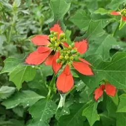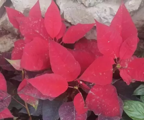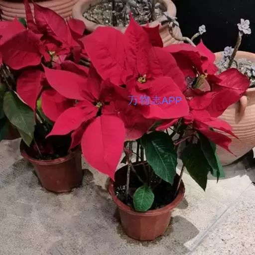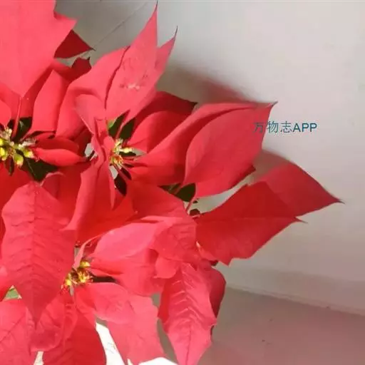 一品红为常绿灌木。茎直立,含乳汁。叶互生,卵状椭圆形,下部叶为绿色,上部叶苞片状,红色。花序顶生。常见品种有