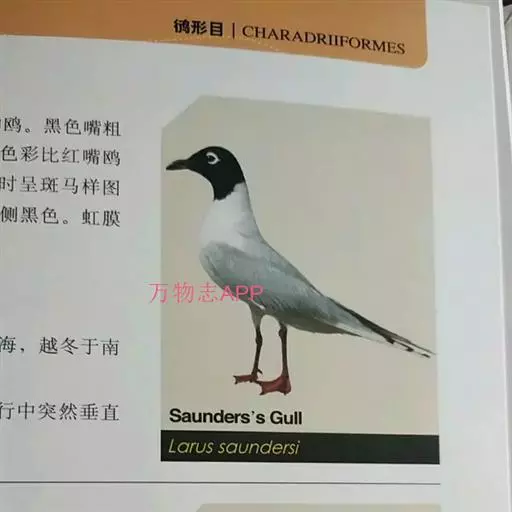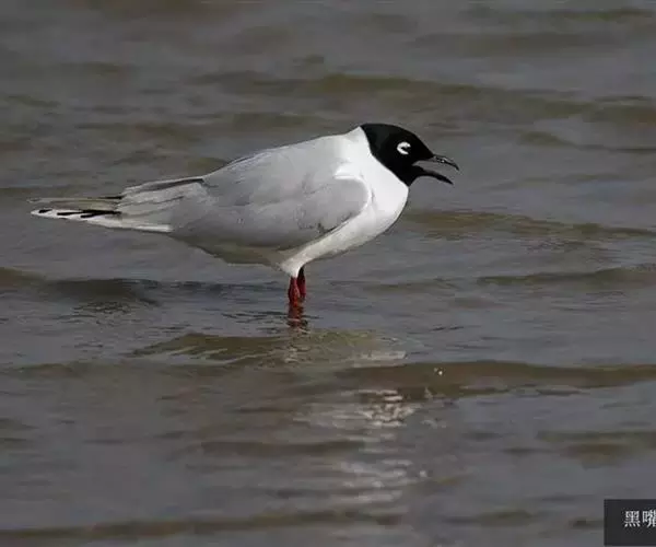 黑嘴鸥 (学名:Larus saundersi)中型水鸟,体长31~39厘米。嘴黑色,脚红色。夏羽头黑色,眼上和眼 下具白色星月形斑,在黑色的头上极为醒目。颈、腰、尾上覆羽、尾和下体白色。初级飞羽末端具黑色斑点。翼下仅部分初级飞羽黑色,与整个翼下表面和下体白色形成鲜明对比。飞翔时甚为醒目。冬羽和夏羽相似,但头白色,头顶有淡褐色斑,耳区有黑色斑点。