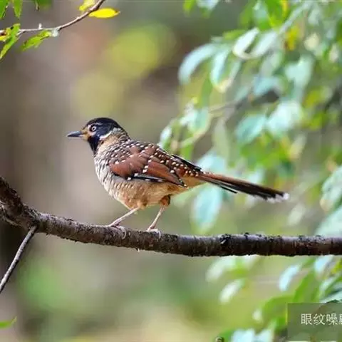 大噪鹛:中型鸟类,体长32-36厘米。额至头顶黑褐色,背栗褐色满杂以白色斑点,…