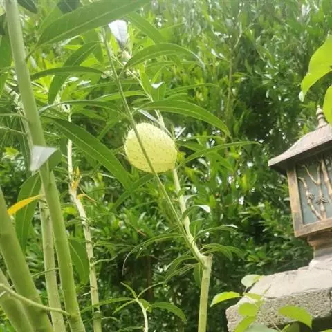 蓇葖披针形,长7-10厘米,渐尖,外果皮厚,无毛;种子宽卵形,长约8毫米,顶端具白色绢质种毛。花期5-8月,极少结果。