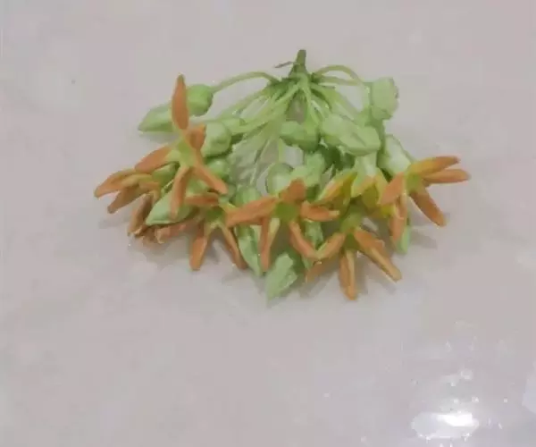 伞形状聚伞花序腋生,着花多达30朵;花序梗长5-15毫米,被微毛,花梗长1-1.5厘米,被微毛;花芳香,夜间更盛;花萼裂片长圆状披针形,外面被微毛,花萼内面基部具有5个小腺体;花冠黄绿色,高脚碟状,花冠筒圆筒形,喉部被长柔毛,裂片长圆形,长6毫米,宽3毫米,具缘毛,干时不折皱,向右覆盖;副花冠5片,膜质,着生于合蕊冠上,腹部与花药粘生,下部卵形,顶端舌状渐尖,背部凸起有凹刻;花药顶端具内弯的膜片;花粉块长圆形,直立;子房无毛,心皮离生,每室有胚珠多个,花柱短柱状,柱头头状,基部五棱。