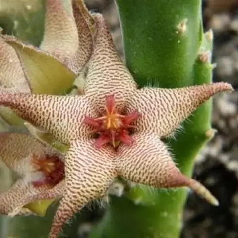 巨花犀角又称大豹皮花,是夹竹桃科犀角属的一种植物。茎粗,花大,边缘生长细毛。植株柱形多分枝呈丛生,…