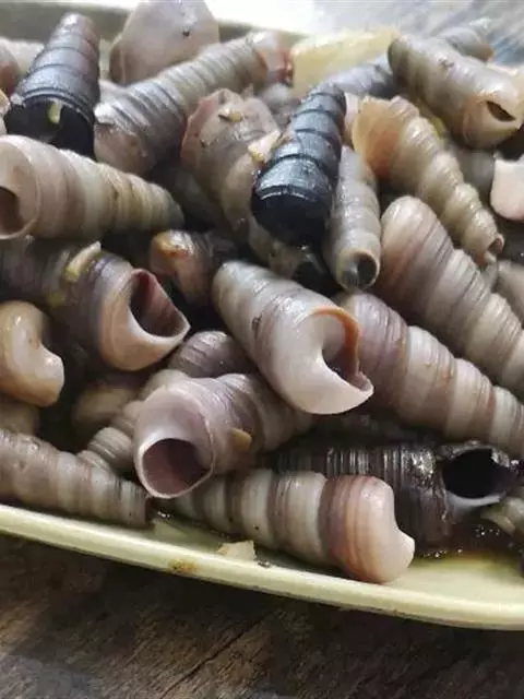 山坑螺呈圆锥形,如小手指大小,每年秋天是吃山坑螺的最佳时节。