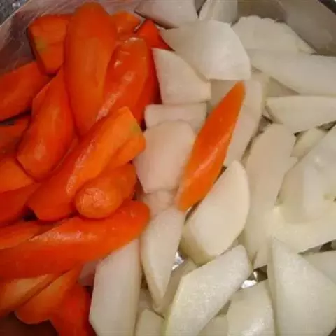 将萝卜切成粗细均匀的条块,曝晒三至五天,然后分两次进行腌制。第一次按每百斤白条萝卜加盐三斤的比例,拌匀揉透,分批入缸。装缸时,放一层,踏一层,逐层踏实。经过三天,出缸再次晒二、三天。而后进行第二次腌制,以每百斤加盐一斤半的比例,再拌匀揉透,仍分批入缸,腌制七天左右,就可以装坛贮藏。